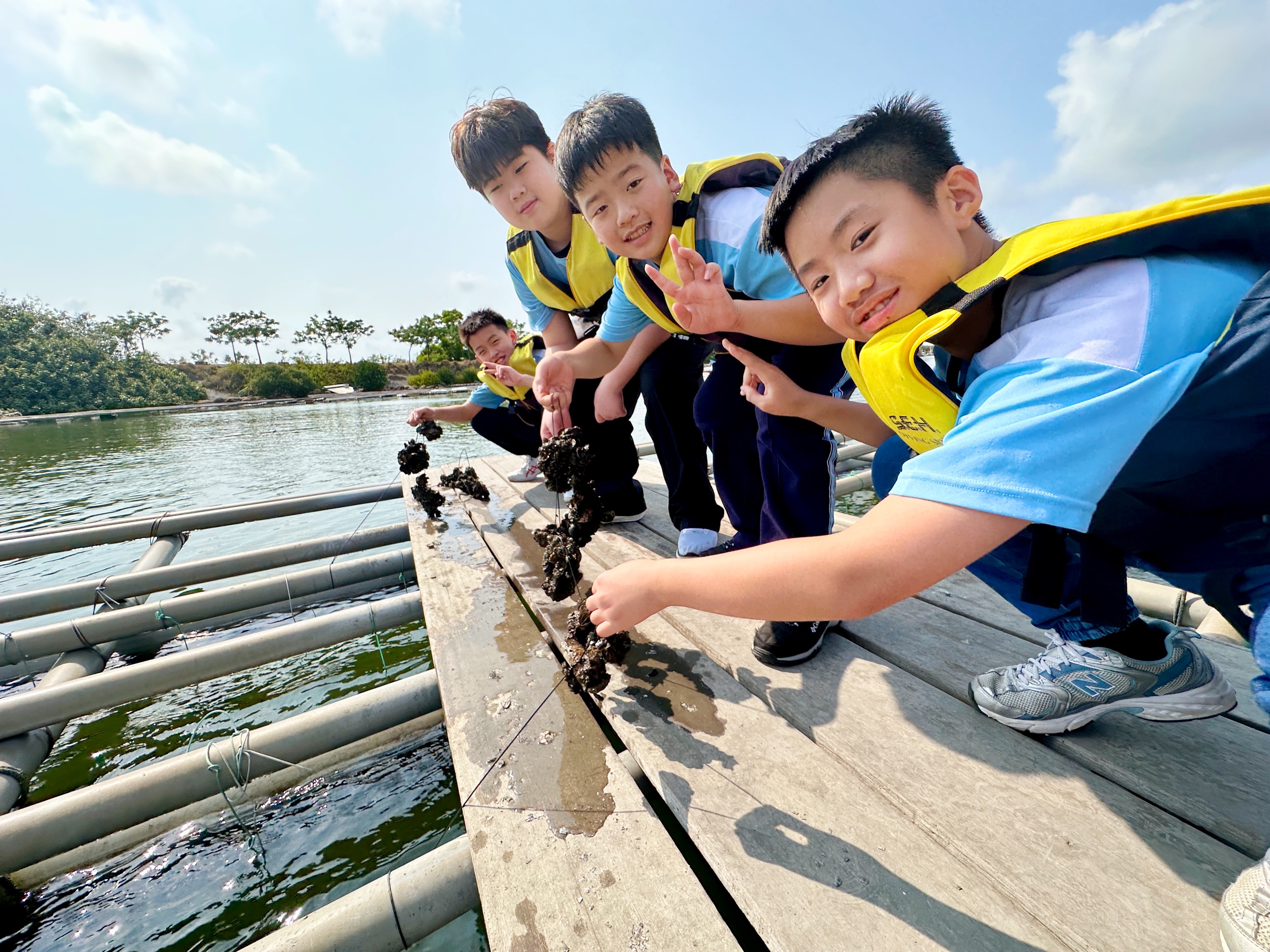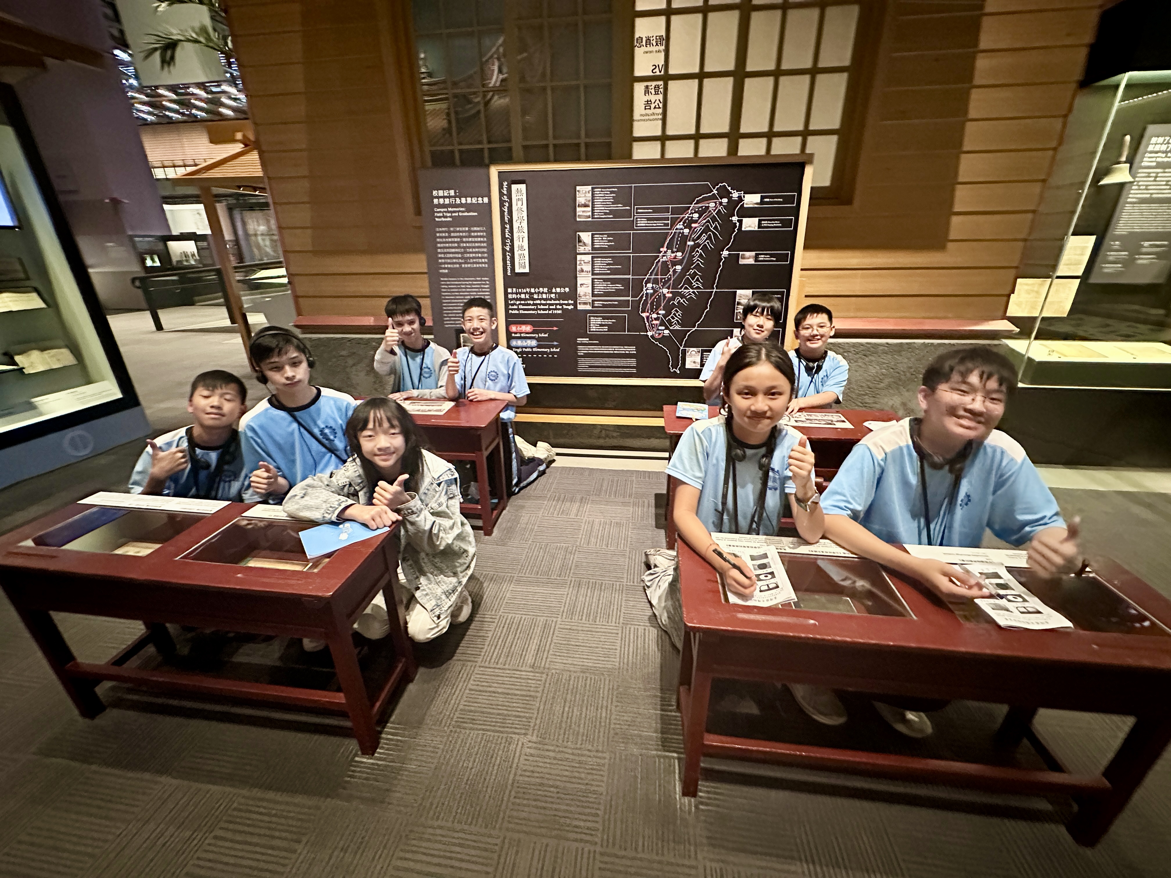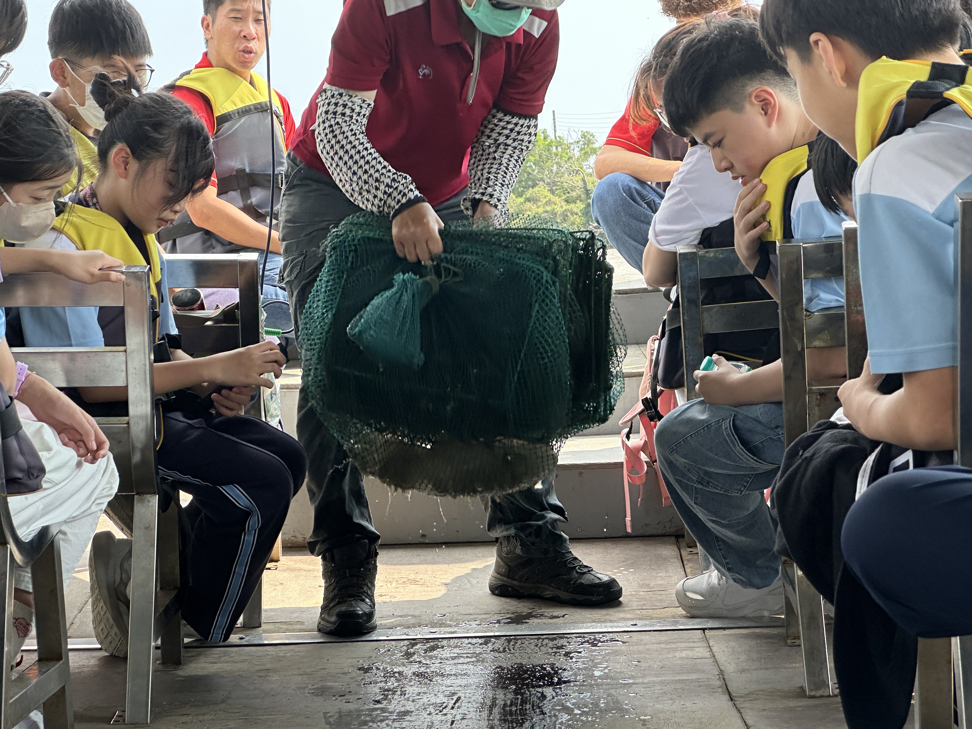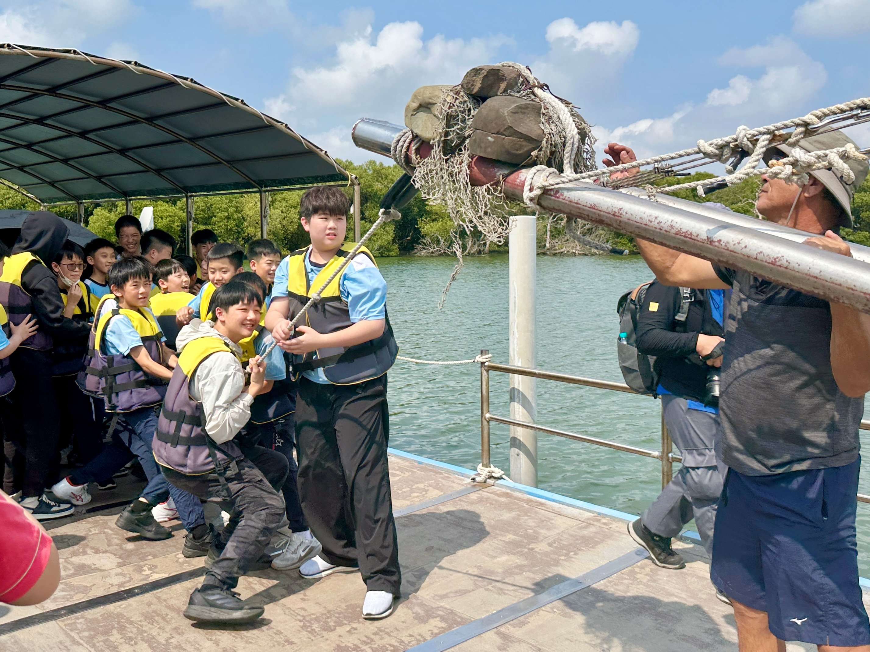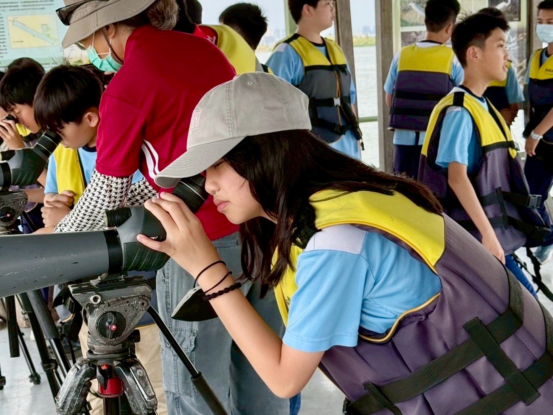下午首先來到台江漁樂園,學生搭乘膠筏船,沿著蜿蜒水道穿越紅樹林。親身體驗吊罾捕魚,專注觀看蜈蚣網放置、漁夫撒網的技藝,親手觸碰牡蠣、魚蝦和水母,並於賞鳥平台觀察候鳥,興奮不已。接著轉往臺灣歷史博物館,學生們化身小偵探,細心觀察館藏展品、完成學習單。展場中的各種角色及情境變換,讓學生充分感受臺灣歷史的時代風貌。