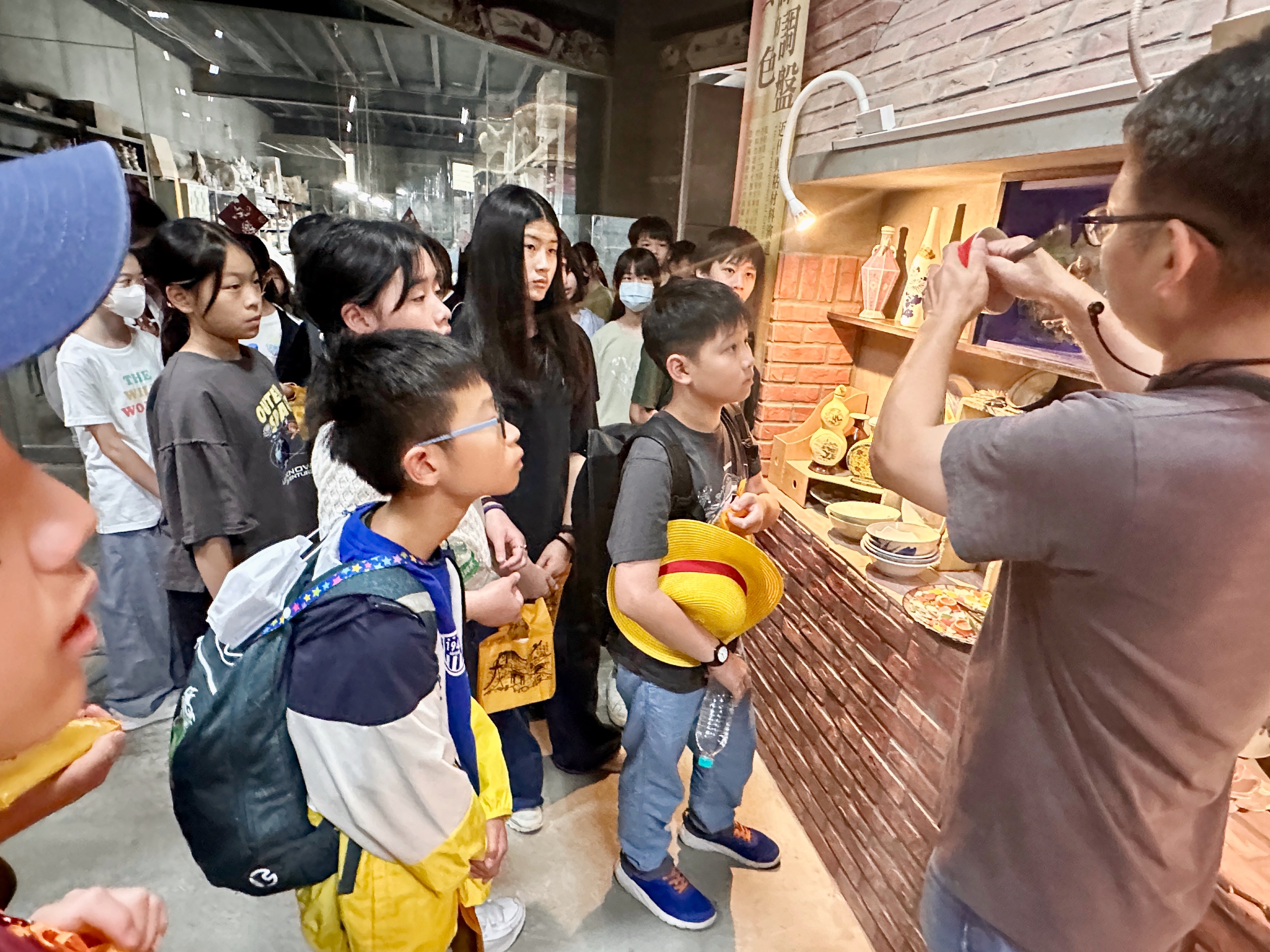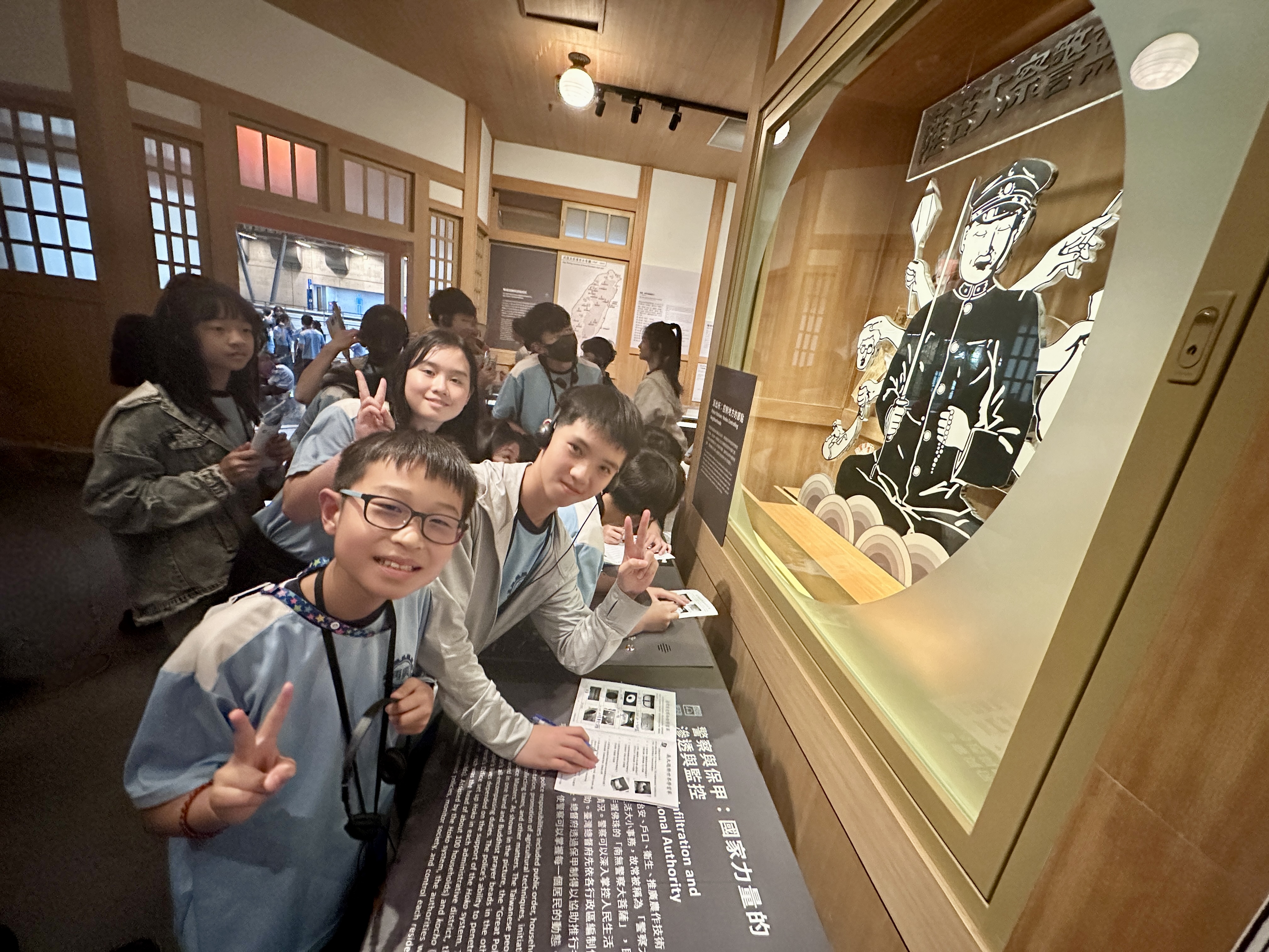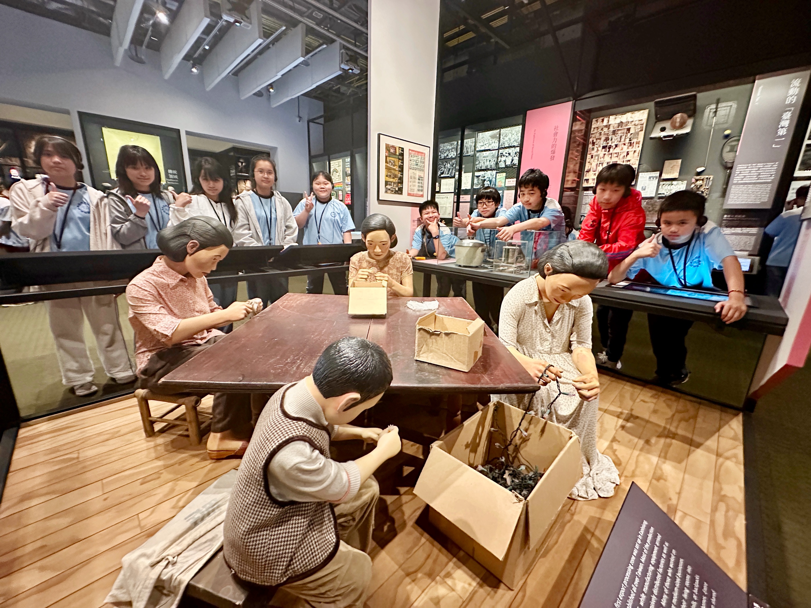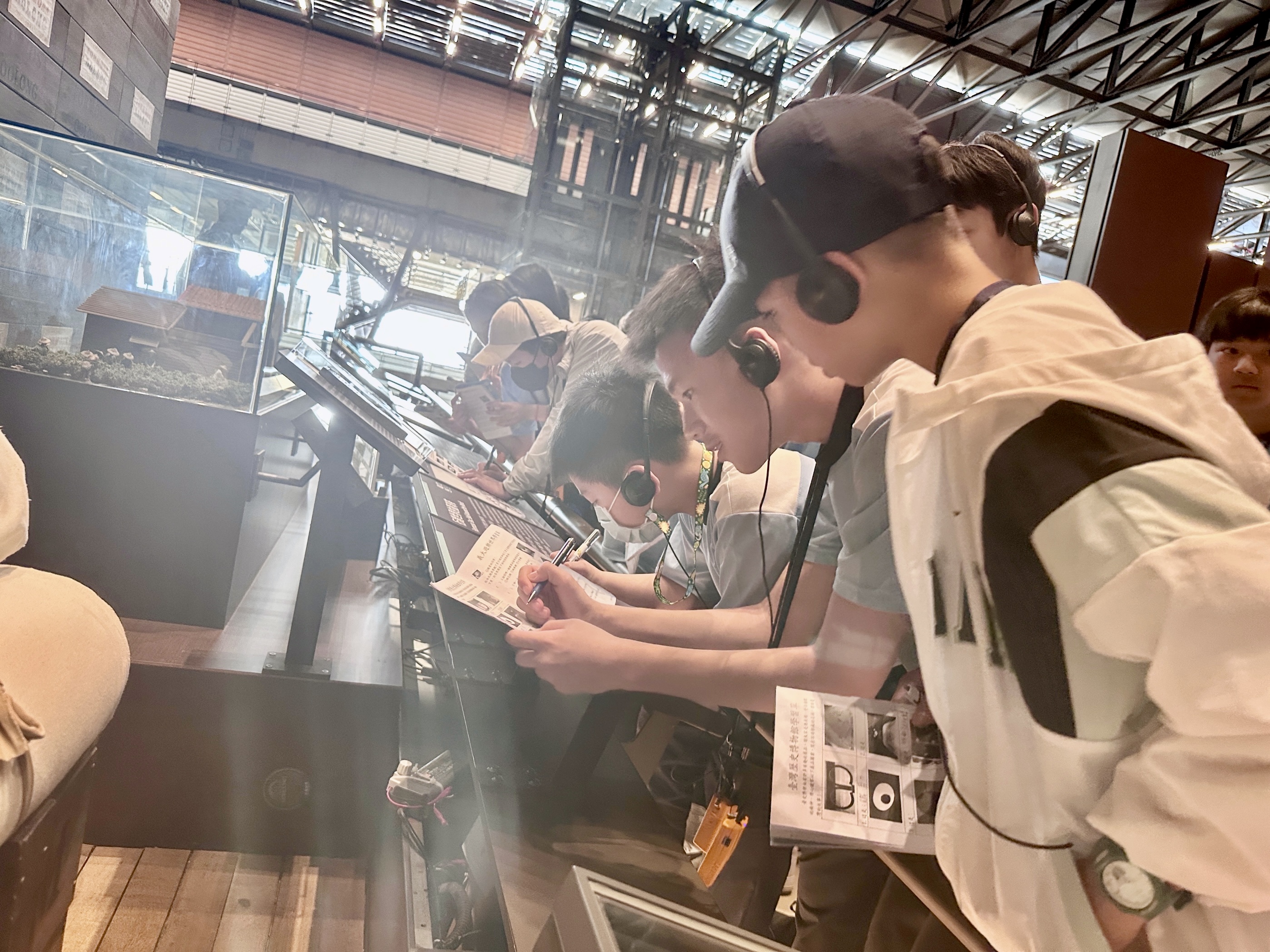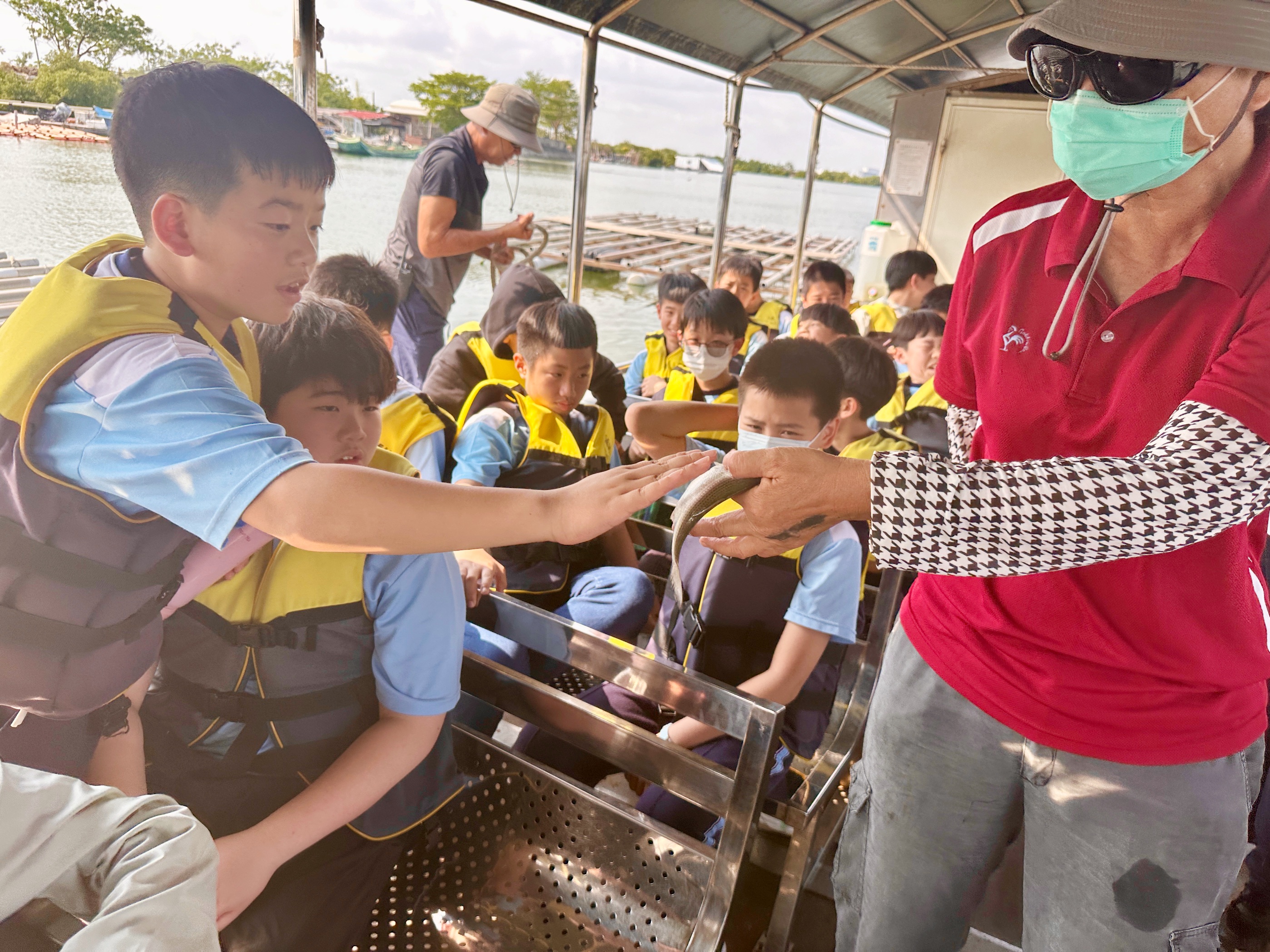下午首先來到台江漁樂園,學生搭乘膠筏船,沿著蜿蜒水道穿越紅樹林。親身體驗吊罾捕魚,專注觀看蜈蚣網放置、漁夫撒網的技藝,親手觸碰牡蠣、魚蝦和水母,並於賞鳥平台觀察候鳥,興奮不已。接著轉往臺灣歷史博物館,學生們化身小偵探,細心觀察館藏展品、完成學習單。展場中的各種角色及情境變換,讓學生充分感受臺灣歷史的時代風貌。