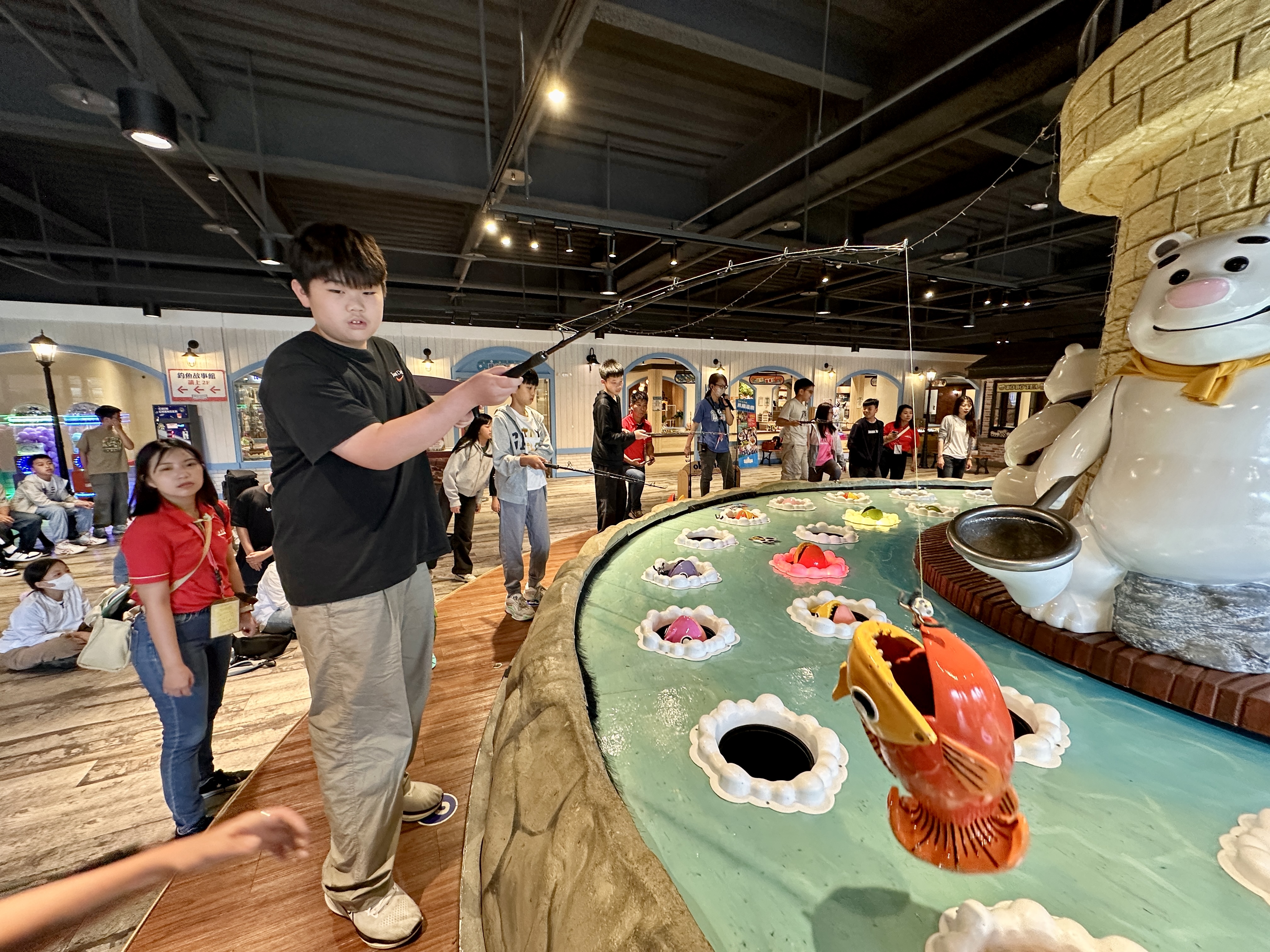午餐後抵達寶熊漁樂碼頭,從釣具生產線導覽到海洋教育主題展覽,從手作魚拓書籤DIY到3D海洋劇場體驗,這裡,每一個活動都讓學生收穫滿滿,其中,最受歡迎的是「大型釣魚機」,現場充滿了歡笑與加油聲,學生們爭相挑戰成為最佳釣手,為這趟旅程添上最難忘的篇章。