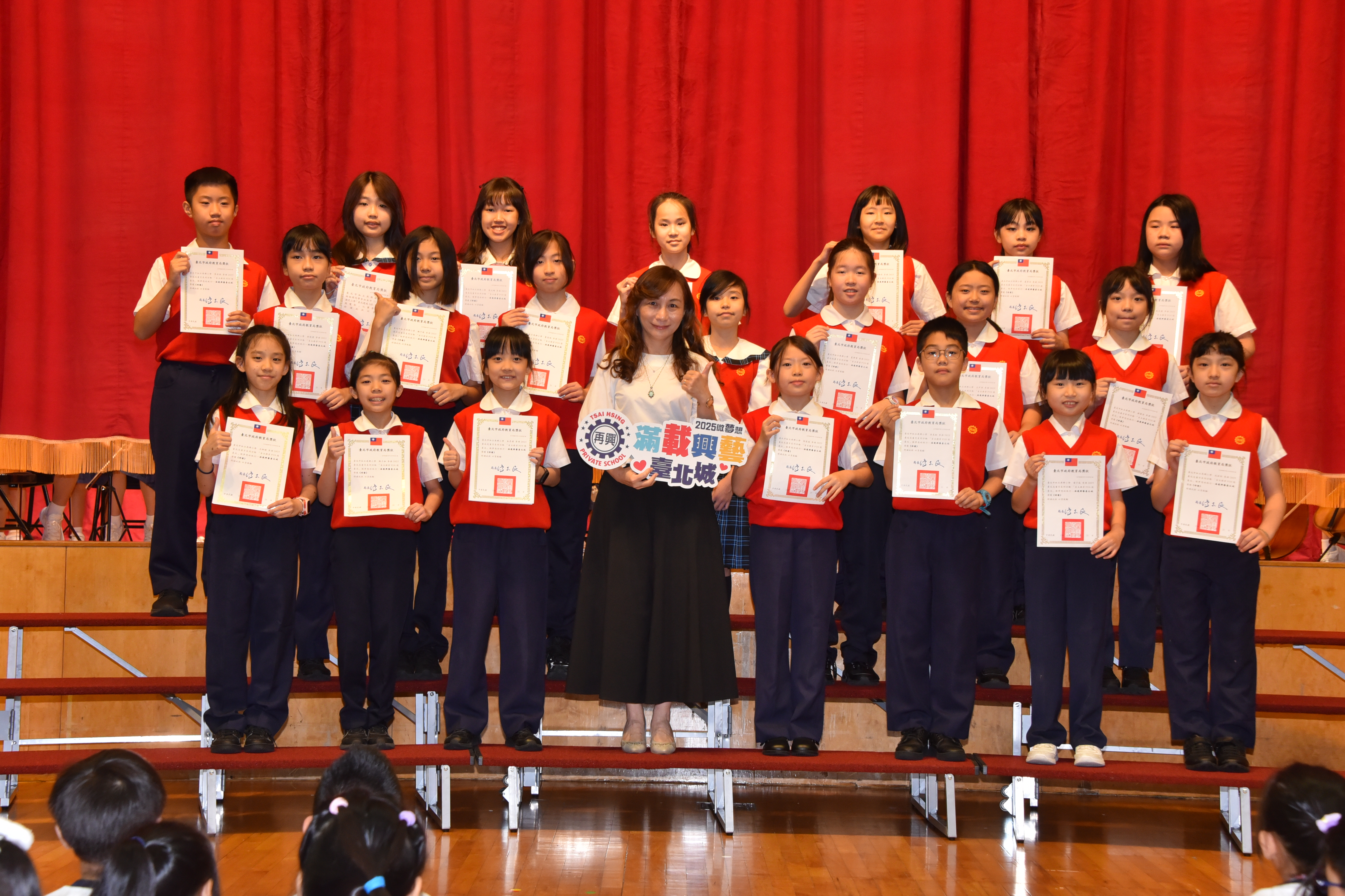 表演活動開始前,再興小學和大家一起回顧「微夢想旅行」的榮耀旅程——十一年來年年參加,年年榮獲特優肯定。楊珩校長為團隊頒獎,談到這份榮耀不僅來自師生的努力,也來自家長一路以來的支持與陪伴,感謝所有家長與教育夥伴,用無私的關愛,點亮每位孩子的未來;未來,再興小學師生將繼續攜手出發為永續的地球與社會共同築夢,讓每一個孩子的夢想都能成為改變世界的力量。 |