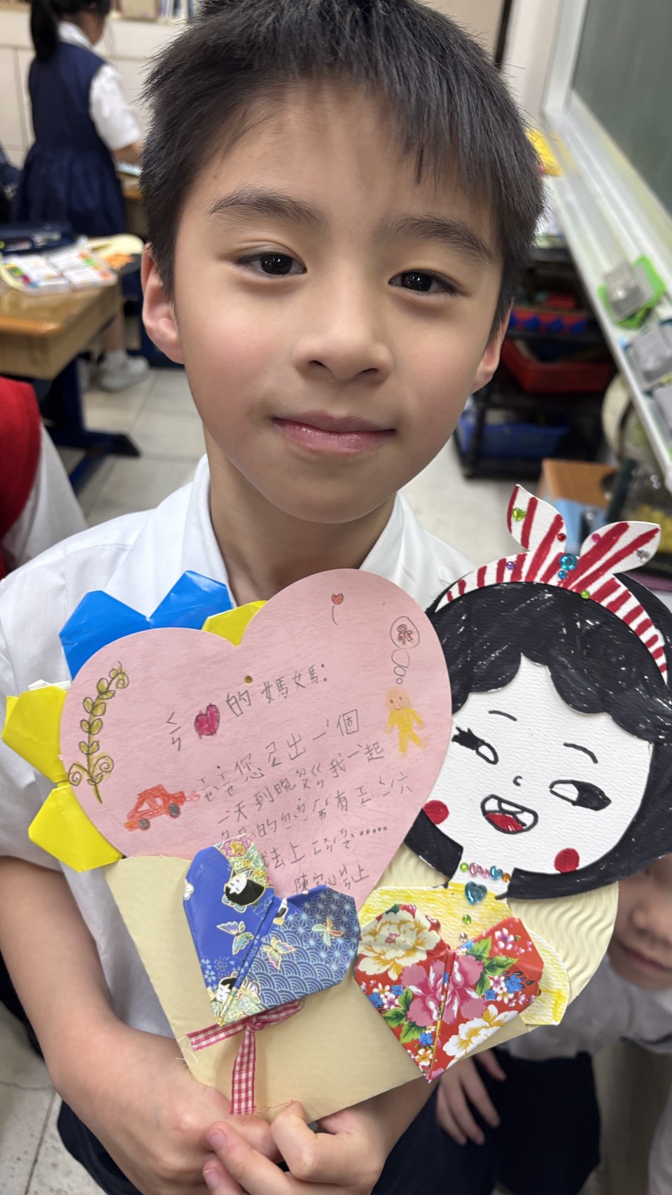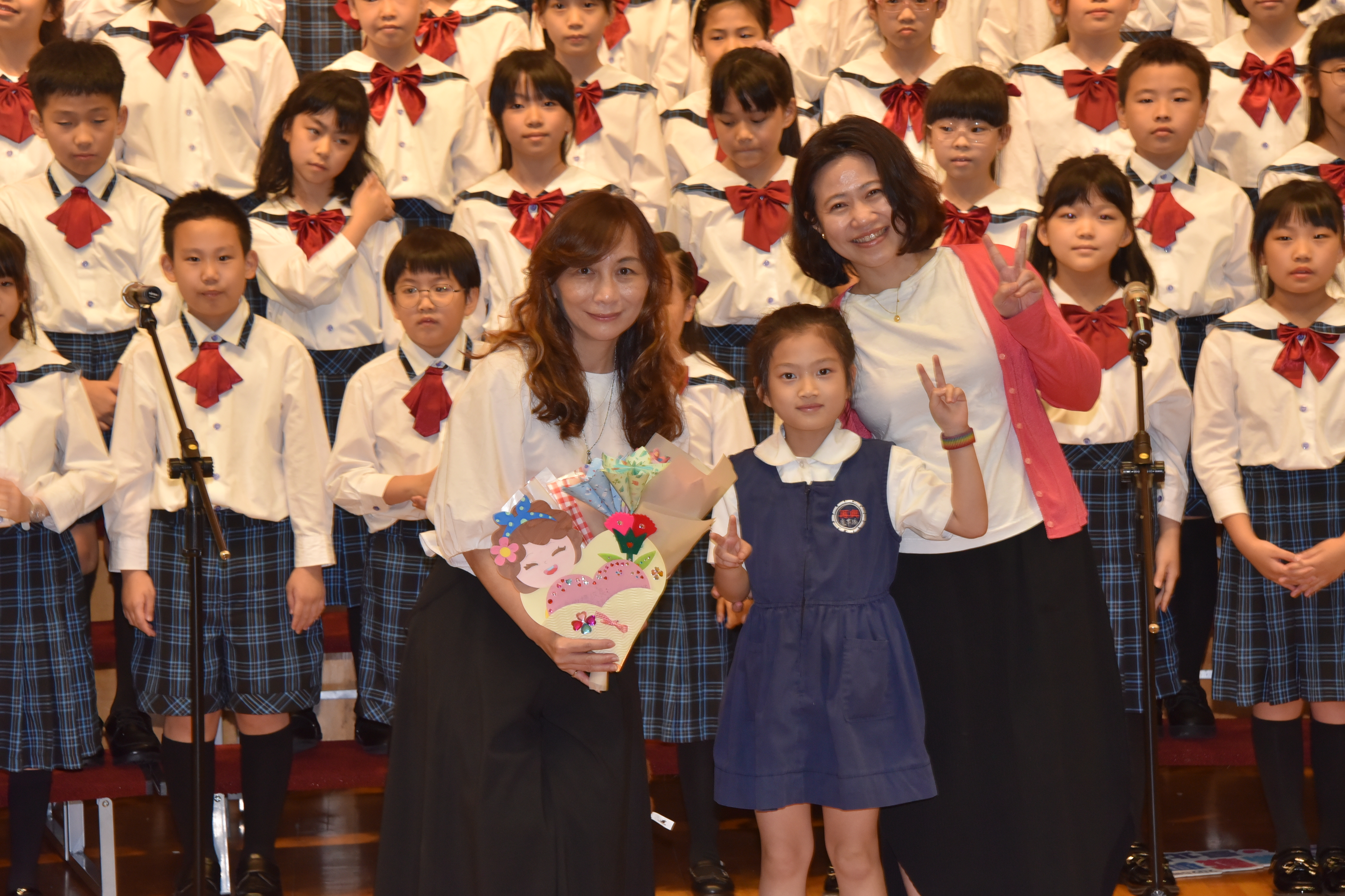 在活動尾聲,薛祺薰老師和盧芊瑀同學代表全校獻上親手製作的母親節卡片,向校長和所有媽媽們致上最深的祝福;全校學生齊聲高唱「有妳的地方是天堂」,邀請媽媽們一同走到台前,接受孩子用充滿愛的歌聲表達感謝。 |