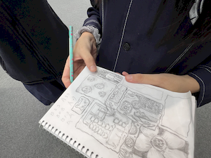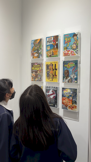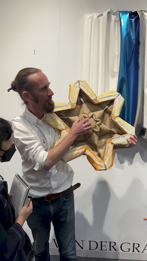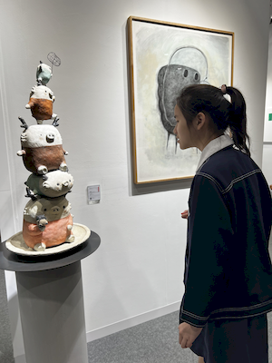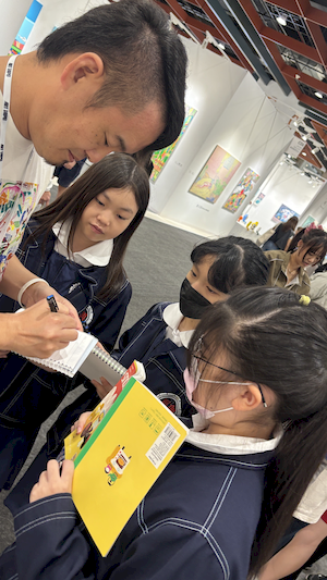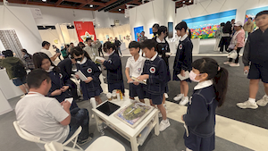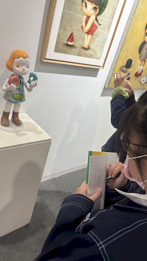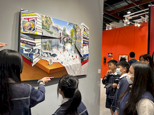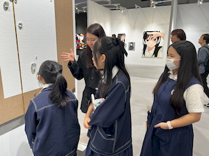 參觀的腳步裡,學生有的拿起素描本記錄靈光,有的主動與來自日本、韓國、荷蘭的藝術家對談。藝術家們熱情地回應——有人用手電筒照亮雕塑的紋理變化,老師邀請孩子用手機與肉眼比較拼貼畫的立體層次,也有人遞出圖卡讓他們尋找畫作中的隱密細節。有人乾脆取下作品示範,或在學生的筆記本上簽名留念。那一刻,藝術不再高懸於牆,而是溫柔的伸出手,成為可親可近的朋友。