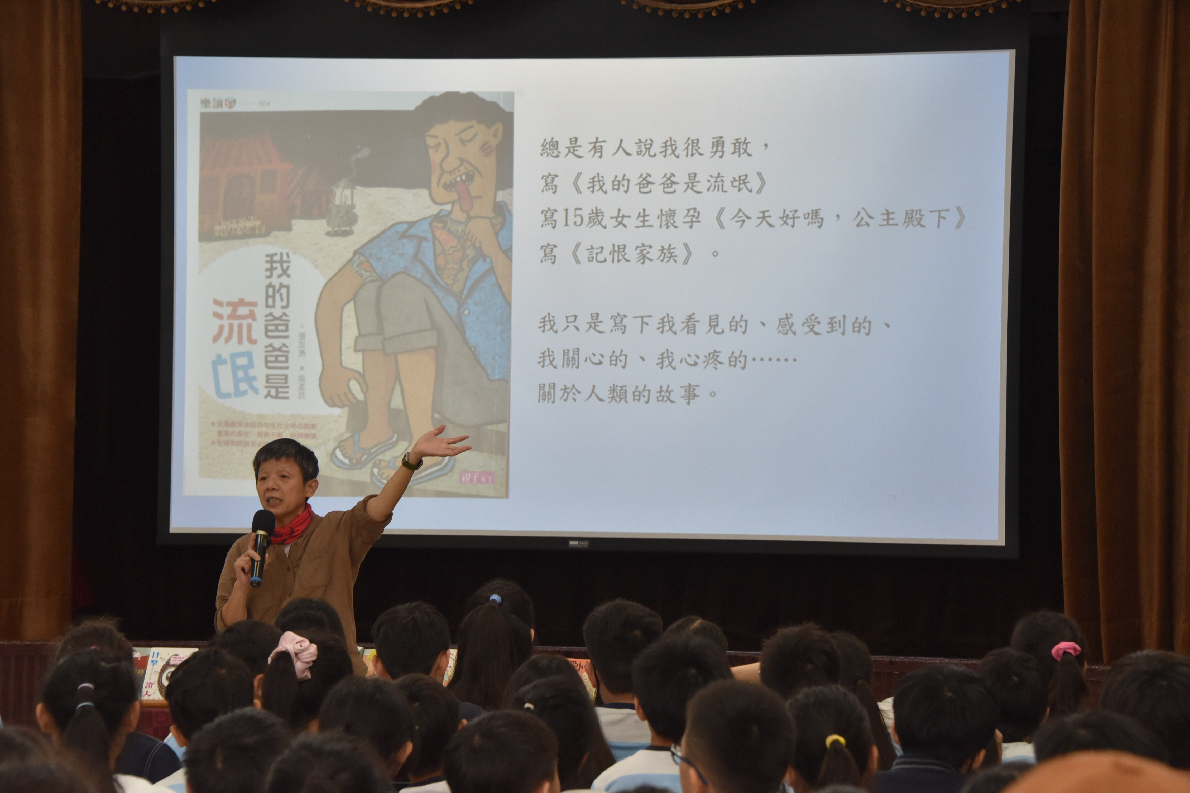 分享席間告訴孩子們一本書的誕生,重要的是收集生活中一些特別的時刻,不論是美麗的、悲傷的、憤怒的、荒謬的、失望的感受,或是旅遊中的發現,都可以作為故事的素材,勉勵孩子要練習讓生活與寫作結合,讓自己處在尋找的氛圍裡。更以《我的爸爸是流氓》、《今天好嗎,公主殿下》、《記恨家族》等作品為例,分享故事的創作靈感皆源自於作者的所見所聞及感受。比如第一本書是展現補習班教書時,對手臂受傷學生的關懷;第二本書是對未成年小媽媽的關懷與對女性愛護自己的呼籲;第三本書則是傳達家家有本難念的經,如何化解家族恩怨值得大家思考;這些創作歷程能讓孩子們了解能寫出一本好書是因為作者樂於主動關心周遭人事物,並在適當的時機,將所感所悟化成文字傳遞到讀者心裡。