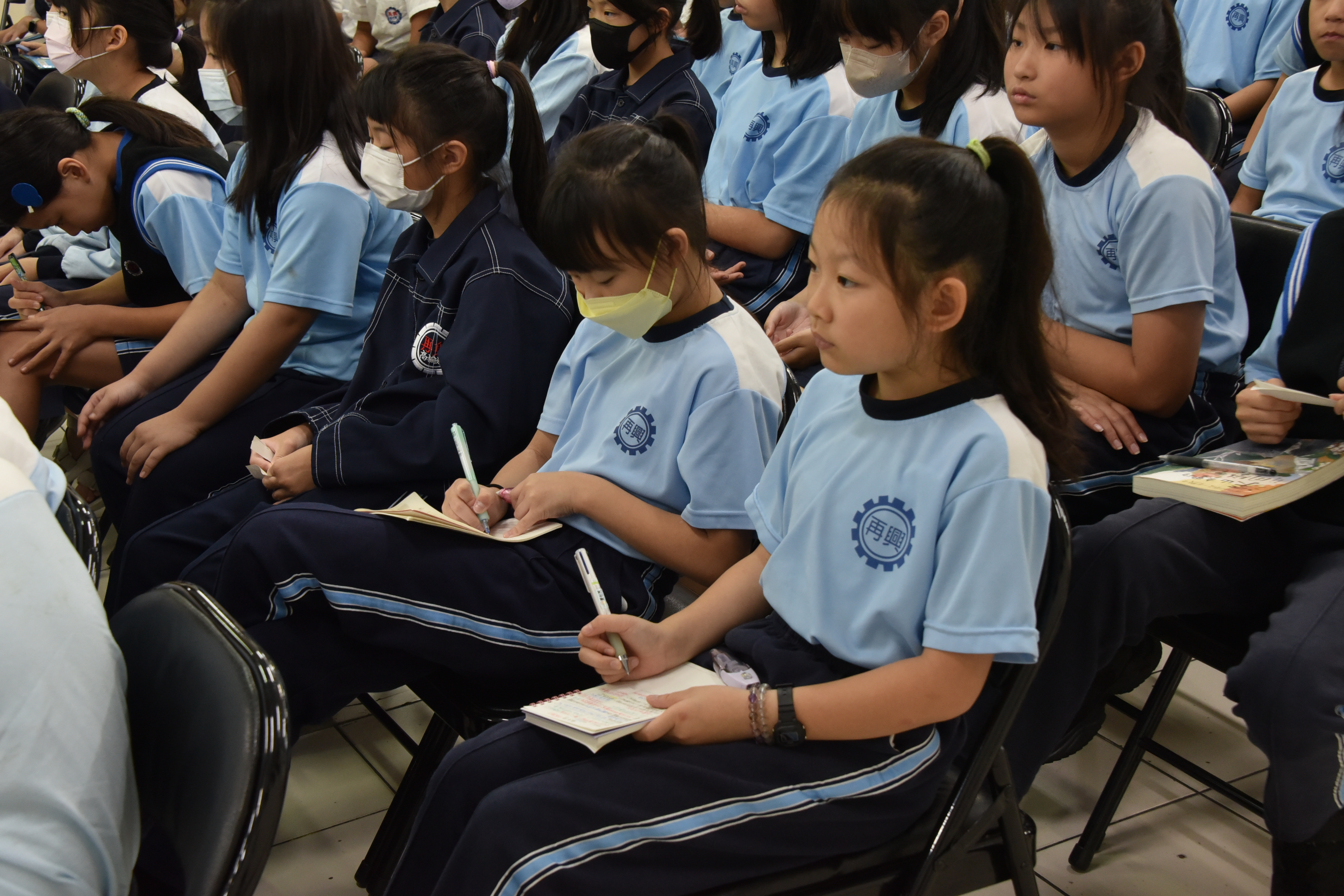 一開場作家和孩子們聊聊自己寫作三十多年以來,發現成為作家的必要條件是能夠主動觀察生活周遭的人事物,並發揮想像力將所見所聞當作寫作素材收納於口袋,日後需要使用時就可以提出參考。她以自己去菲律賓學習英文的一個月中,觀察到牽牛花的攀爬路徑為例,引導孩子們想像牽牛花是有思考能力的,牽牛花計畫攀爬路線,只為爬到樹頂享受陽光、眺望遠方,可見牽牛花的野心和野性使他們渴望去任何地方。藉此經驗勉勵孩子們要主動觀察生活周遭,校園一角、上學或放學途中,甚至有花有草的地方都可能有故事,平時保有童心到處去看看,用好奇心、想像力與創造力面對生活,就能發現人事物不一樣的美麗與奧妙;而一位認真用心的作家,會主動事先做好功課,查詢題材的相關背景資料,再將知識寫到故事裡,像是《深山裡的同學會》的書中有許多動植物的樣貌與特性,都是經過事先調查才能寫出讓讀者身歷其境的感受,增加了讀者的閱讀興趣。