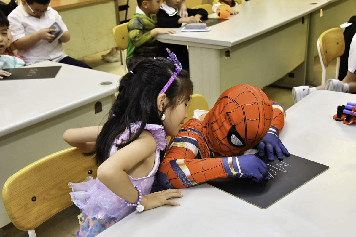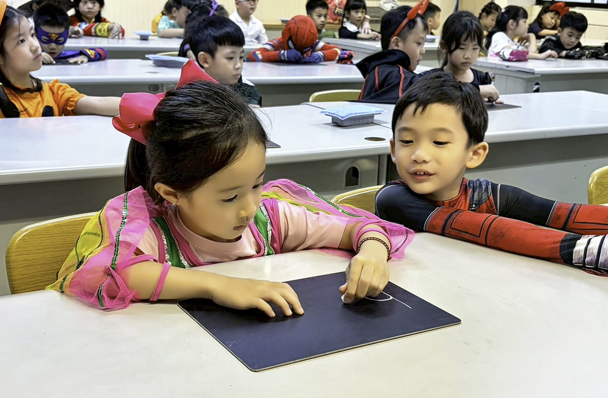 平常要寫作業,總是要三催四請,今天孩子們可不一樣喔。大家盯著Abby老師,注意看她的嘴型,也仔細聽她唸的字詞,一聲令下趕緊在小黑板寫出目標單字。小朋友們紛紛認真討論拼字,互相搶著寫英文的模樣,讓在旁優雅的美女Yolanda老師,給這群熱情投入的孩子標註成績:學習精神一百分!