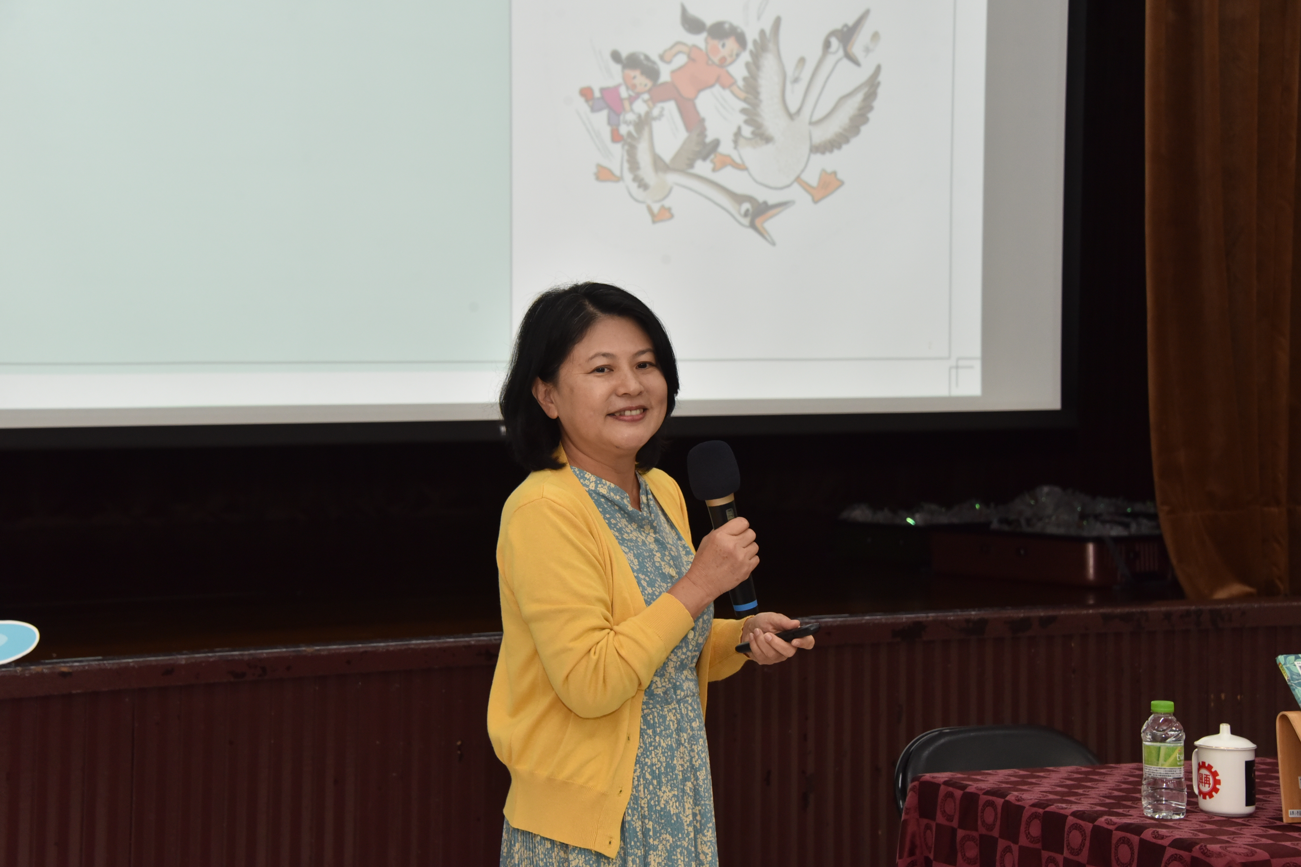 緊接著崔老師開始分享《養鵝記》主角們的點點滴滴,活動現場瞬間充滿了歡笑聲。原來,養鵝的生活超級忙碌又有趣。小鵝那「嘎嘎嘎」的叫聲,既可愛又充滿活力;長大後的鵝更是盡責的「守衛」,只要有人靠近,牠們就會伸長脖子「咬咬咬」來提醒著,甚至連可怕的蛇都不敢靠近!