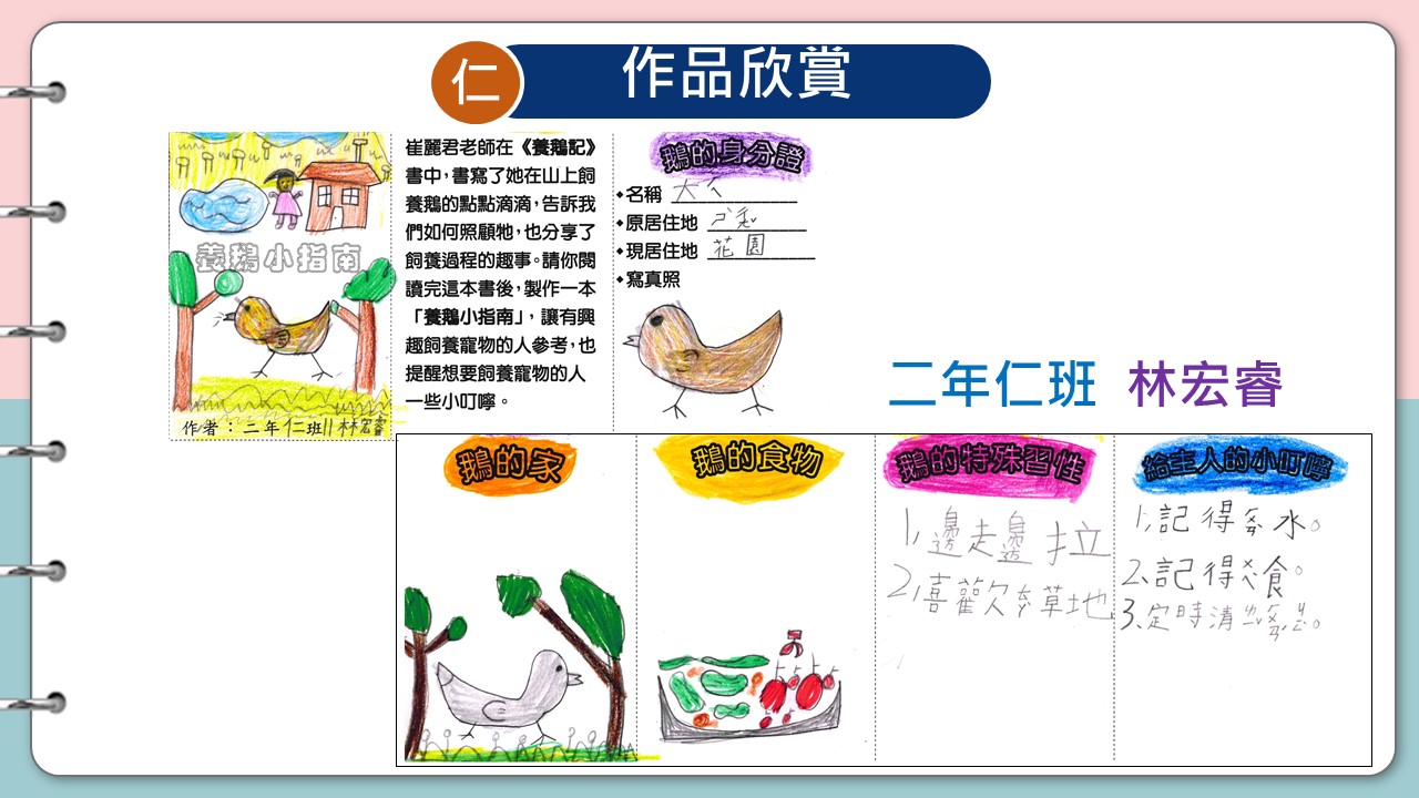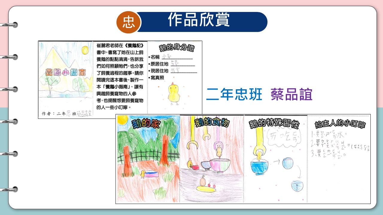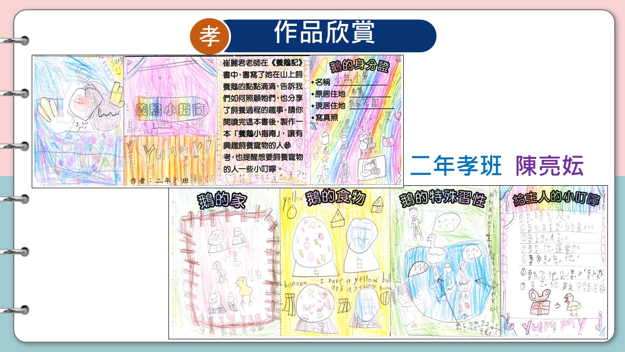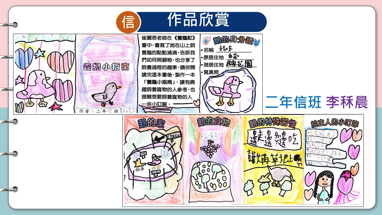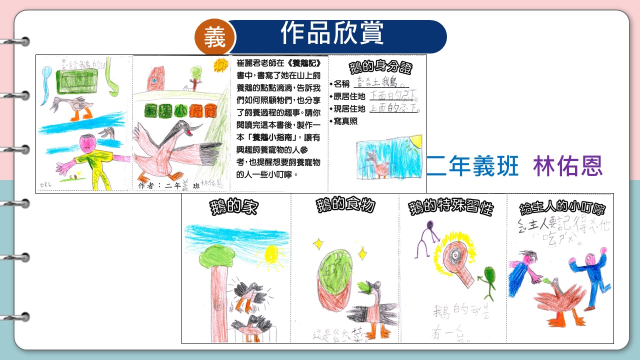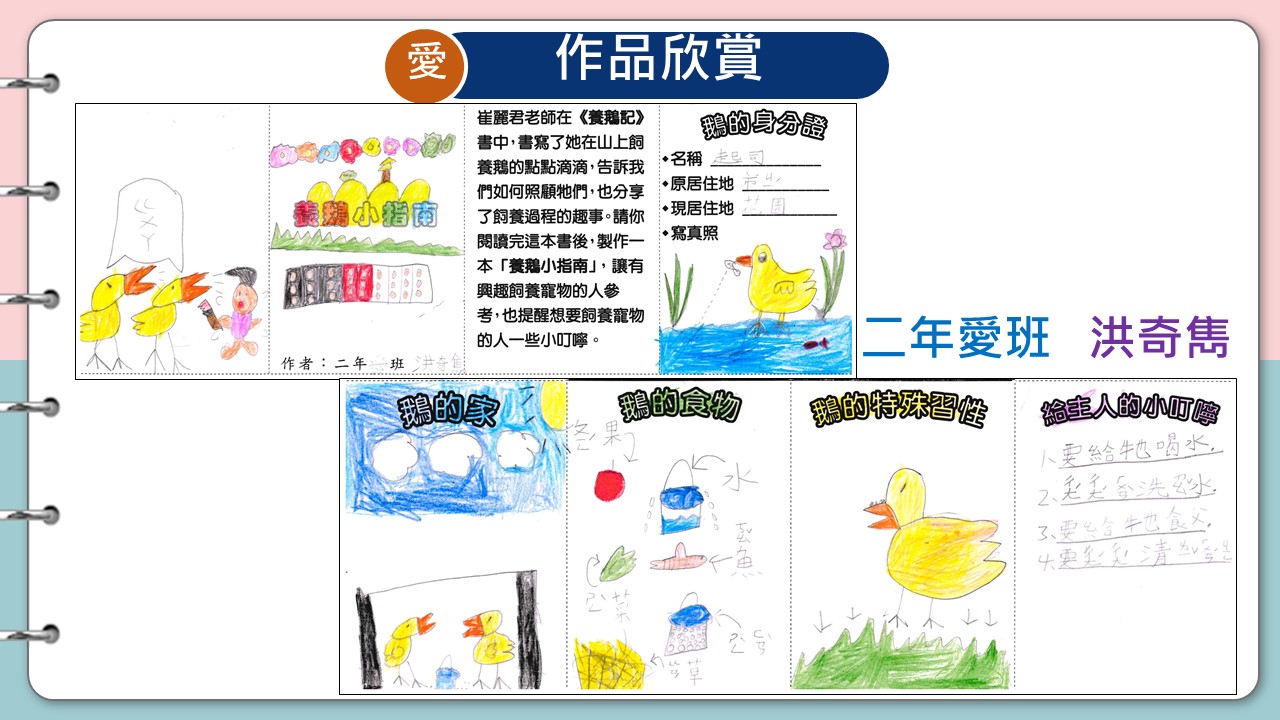 當孩子們興奮地展示作品時,連崔老師都忍不住發出驚嘆!這些小書裡藏著孩子們天馬行空的想像與細膩的觀察:有的同學畫出了「鵝的美味菜單」,詳細列出鵝愛吃的蔬菜;有的特別設計了「小主人叮嚀守則」,教導小主人善盡職責;還有孩子幽默地畫出「小心地雷區」,提醒大家在養鵝的地方走路要看路,才不會踩到「黃金」。