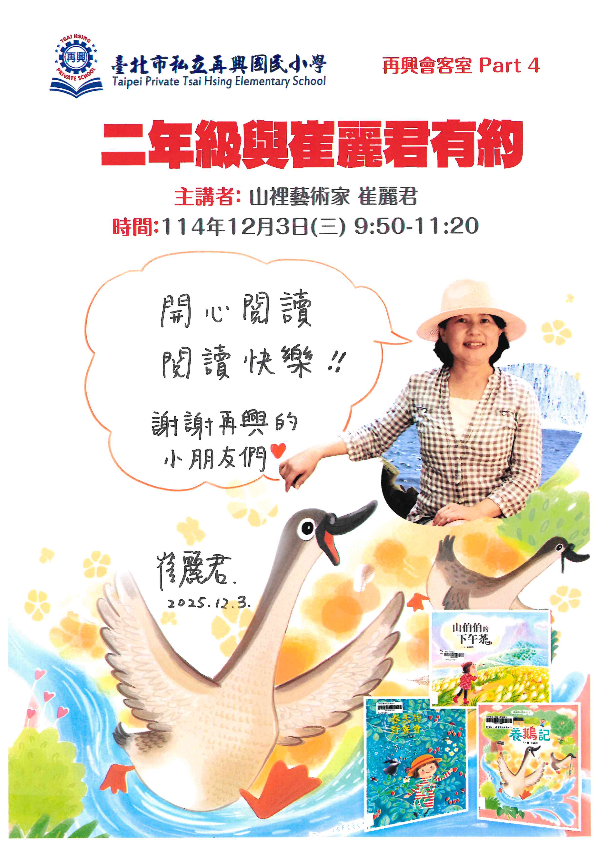 這次的作家有約,不僅是一場好聽的故事分享會,更是一堂生動的寫作實作課。崔麗君老師用她的生活,以及孩子們手中的《養鵝小指南》告訴我們:生活很吵、很忙、很好笑,但也非常美,只要張開眼睛觀察、打開耳朵聆聽,每位小朋友都能成為自己生活的紀錄者,創作出屬於自己的精彩故事。