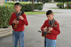 活動由二年孝班謝皓旭、劉瑞宣帶來的相聲揭開序幕。兩位小小相聲演員,用幽默的對話討論什麼是感恩樹、為什麼要感謝他人,逗得全場笑聲不斷,也在歡笑之中,讓孩子們明白:感恩可以輕鬆又真心。接著登場的是六年義班周鈺翔與四年忠班周鈺峰兄弟檔的烏克麗麗演奏,清脆明亮的琴聲,為校慶帶來一陣溫柔的海風。隨後,四年義班高維妮表演拉丁舞,每一個自信的轉身和步伐,都訴說著她長時間練習、不輕言放棄的堅持。緊接著,六年仁班陳琝甯細膩的長笛樂音,帶給大家一段寧靜恬然的時光,音符在空中流動,彷彿替每個人輕輕抹去一天的疲憊。