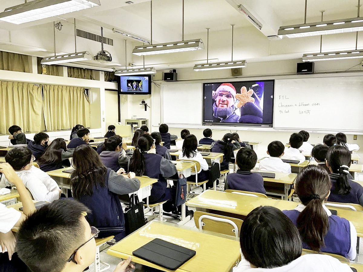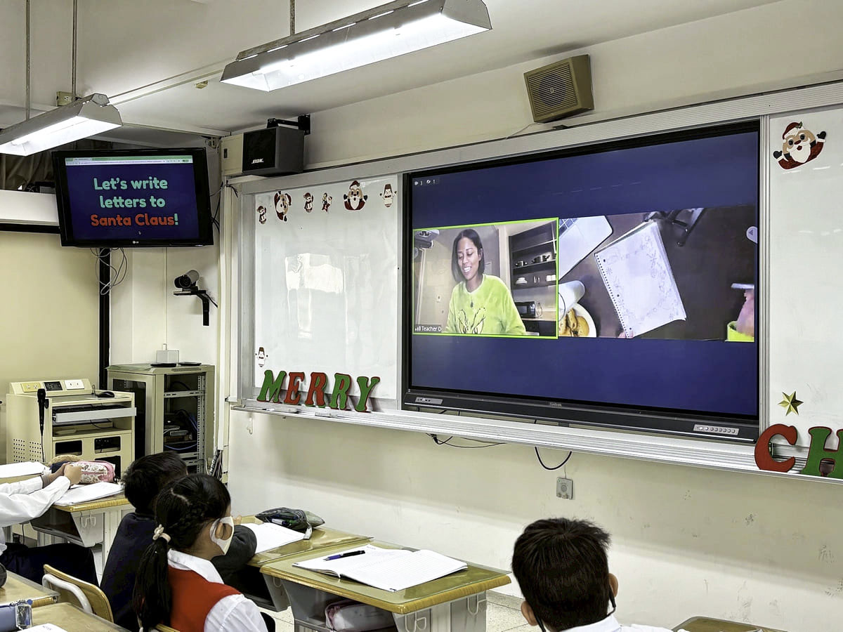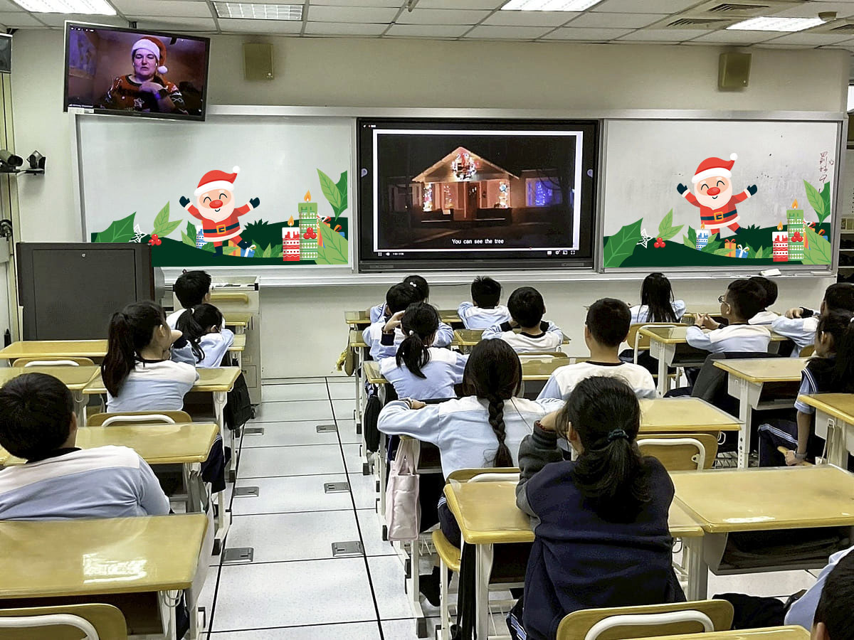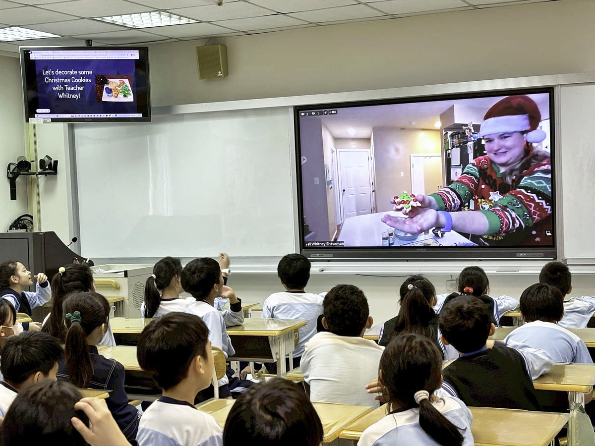 五年級的美國視訊外師則直接邀請孩子們到家中作客,分享過節的傳統家庭活動。兩位外師透過網路即時連線,分別介紹喬治亞州和奧瑞岡州家中的節慶擺飾及代表意義,她們也親自示範如何製作聖誕餅乾,孩子們看得認真專注,學習態度一百分!