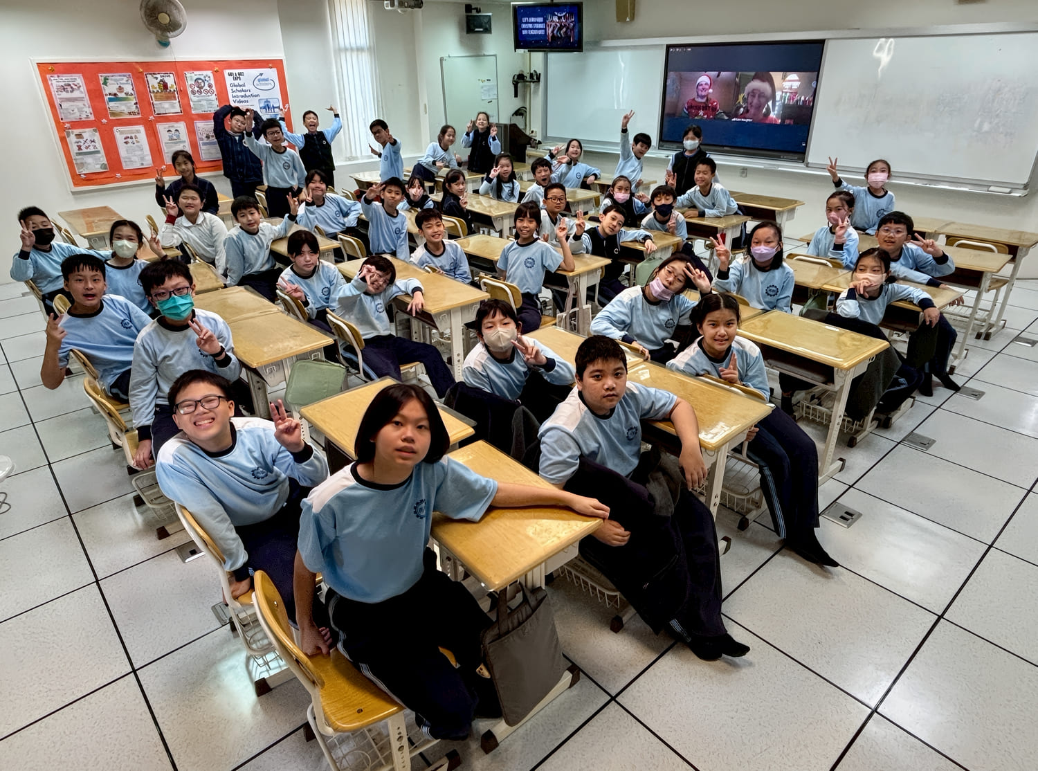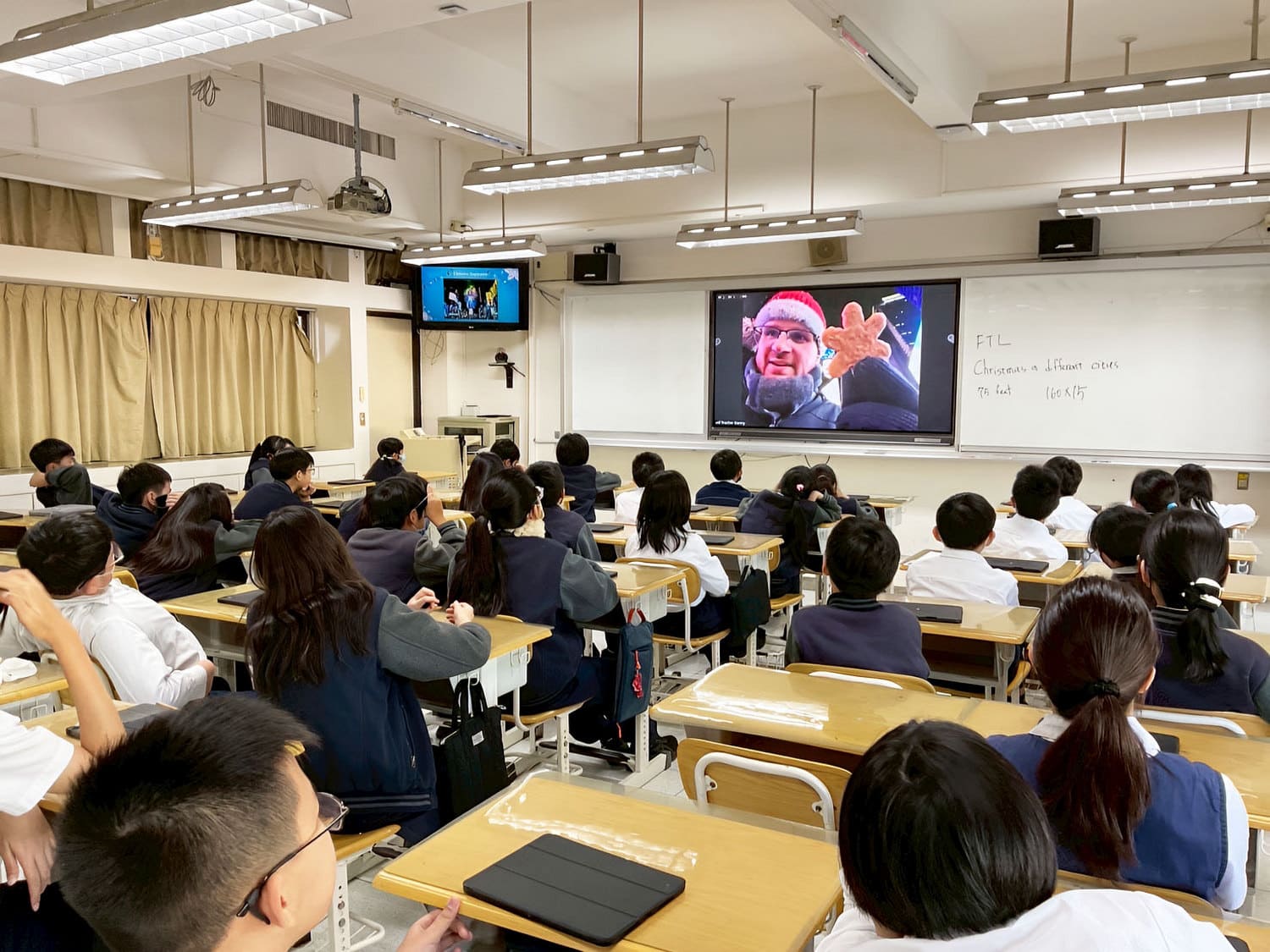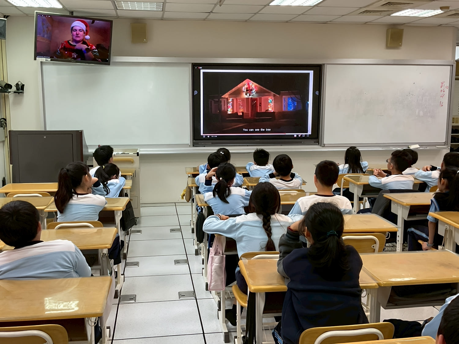 五年級的美國視訊外師則直接邀請孩子們到家中作客,分享過節的傳統家庭活動。兩位外師透過網路即時連線,分別介紹喬治亞州和奧瑞岡州家中的節慶擺飾及代表意義,她們也親自示範如何製作聖誕餅乾,孩子們看得認真專注,學習態度一百分!