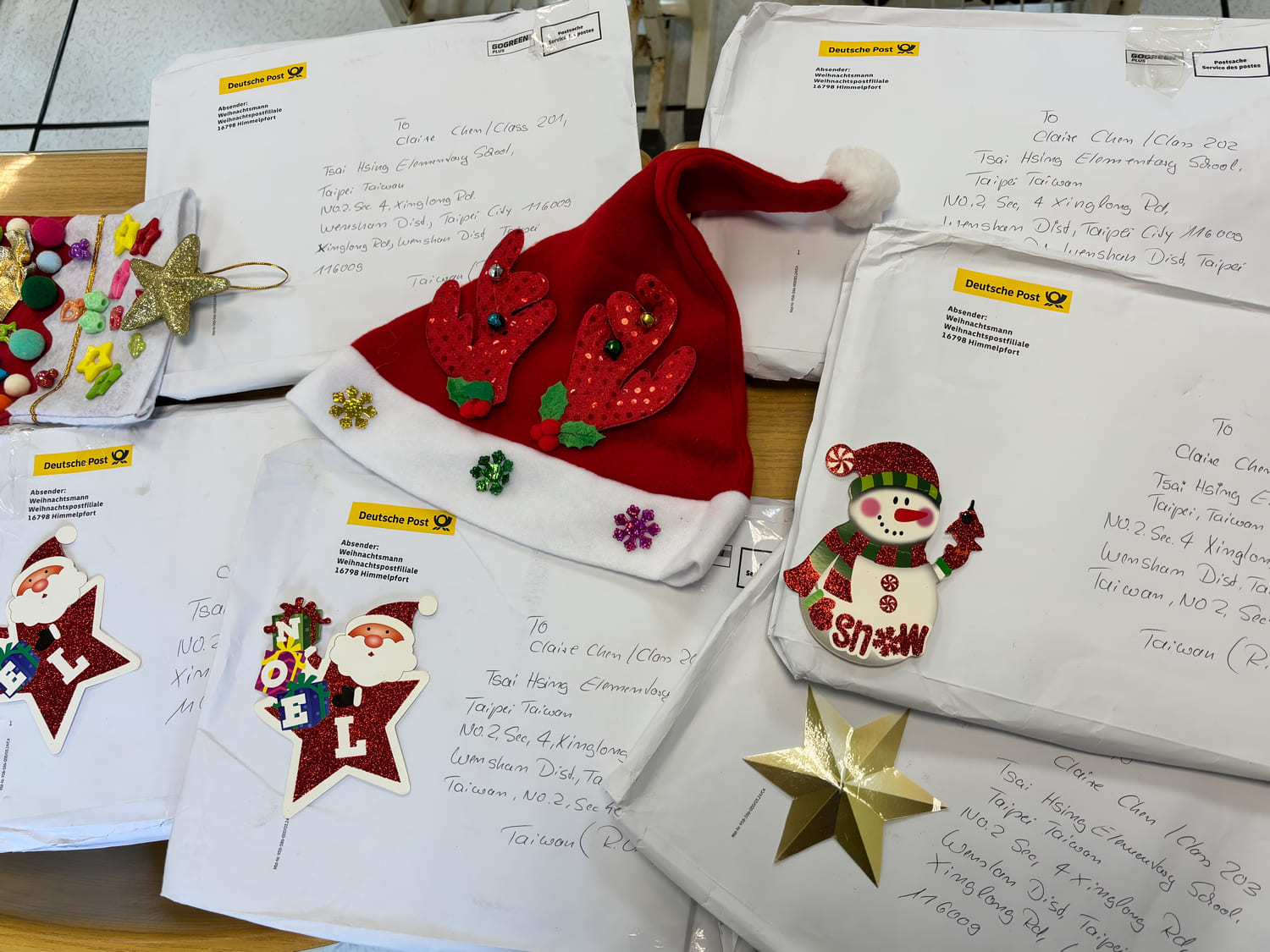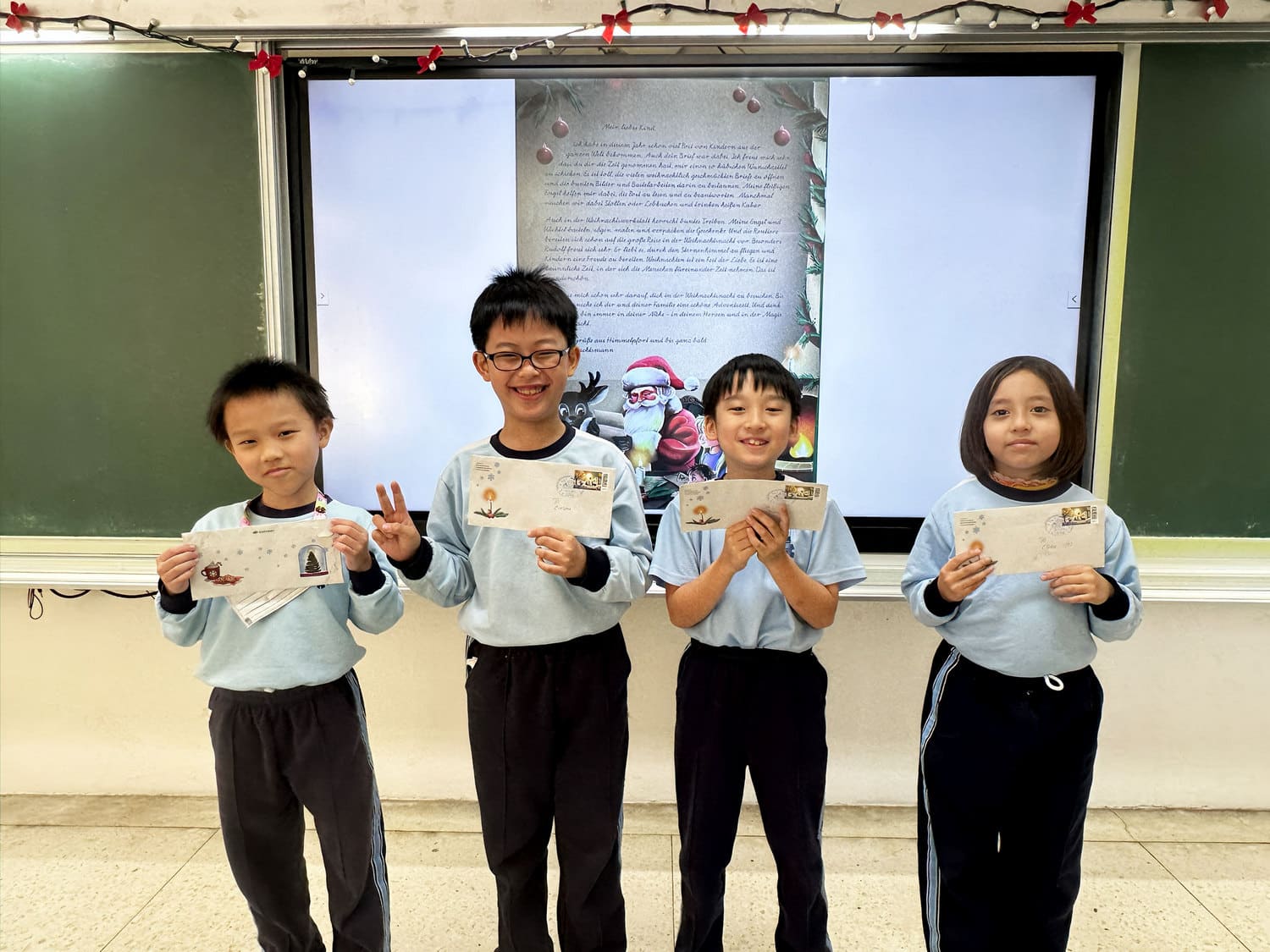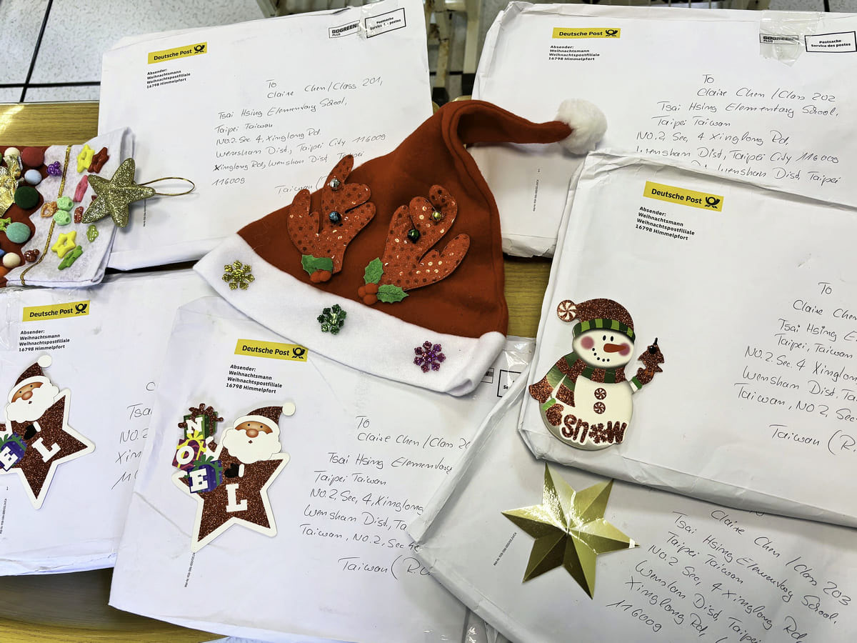二年級的英語老師則帶著孩子們寫信給聖誕老人,簡單的英語、清楚的表達,加上手繪的可愛圖案,每一份信紙都充滿了省思、期待與祝福。而德國的聖誕老公公在接收孩子們的誠摯訊息後,在校慶前夕寄來了溫暖的回信,師生驚喜之餘,相信這個世界充滿愛與希望,更願意把這份精神傳揚出去!