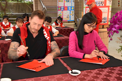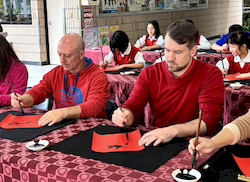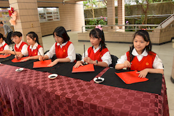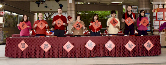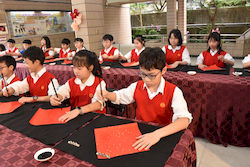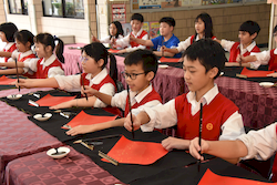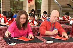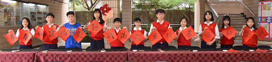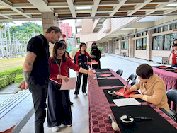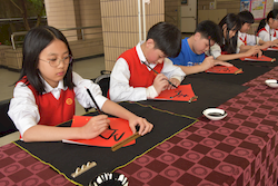 揮毫活動前,全體學生在專業書法教師游淑賢老師引導下進行書法暖身,透過朗朗上口的姿勢與執筆口訣,協助學生調整坐姿、穩定身體與呼吸節奏,建立良好書寫基礎。此一教學設計源自長期書法教學經驗,強調「先安定身心,再進入書寫」,讓學生在學習技法的同時,也培養專注與自我覺察能力。 揮毫過程中,校長、主任及外籍教師與學生同桌揮毫,展現學校推動藝術教育「共學共寫」的理念。透過師生一同參與,讓學生感受藝術學習不僅是課程要求,更是一項值得投入與分享的文化活動。 活動亦邀請曾榮獲全國語文競賽和全國學生美術比賽均榮獲特優和第一名的校友關兆廷同學返校參與,和學弟妹一同揮毫,形塑傳承的學習氛圍。現場同時匯聚多位在語文競賽、美術比賽與書法領域表現優異的學生,提供彼此觀摩與交流的學習機會。