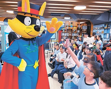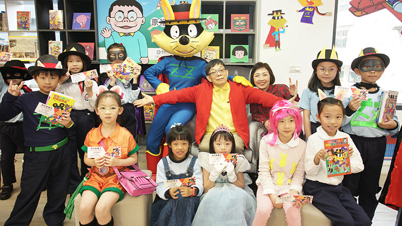 臺北市再興小學學生與《怪傑佐羅力》作者相見歡,圖為佐羅力布偶和學生打招呼。攝影/阮筱琪